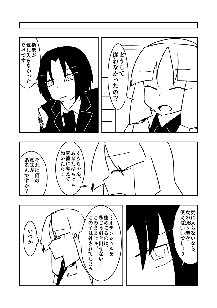 【くろすけ】 「無能な人間を先輩と呼ぶ義理なんてありません」 特別保安部に所属する優秀なアンドロイド「96s-K」。 性別も中性的で敬語を話し、無機質な印象を与える。元は違うバディと組んでいた。 現在は先輩にあたるシルと組まされている…のだがボケボケな先輩に手を焼いている。 現実主義者でプライドが高く、皮肉をよく言うが、コンプレックスの裏返しでもある。 一人称:私/二人称:貴方・(名前)さん 性別:中性 年齢: 6歳(外見17歳) 誕生日:8月25日 身長:160cm/体重:60kg 種族:アンドロイド |