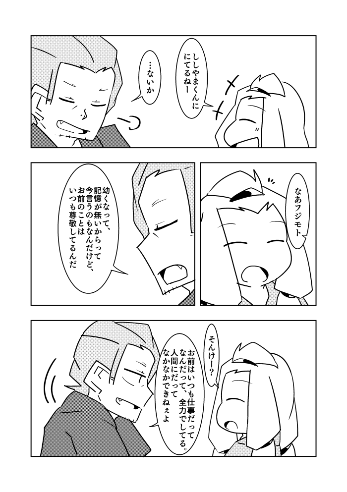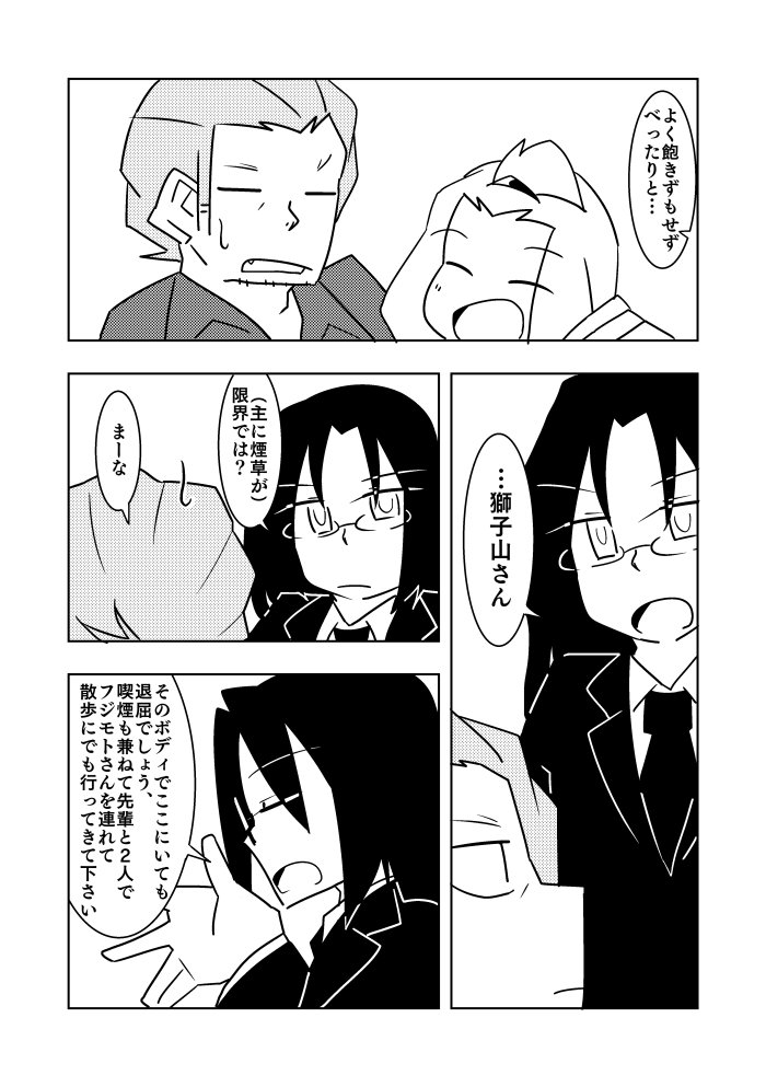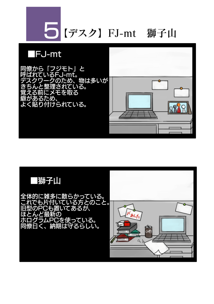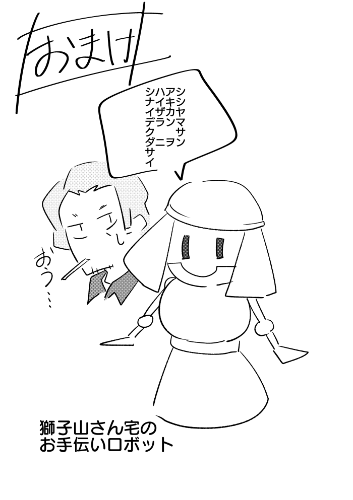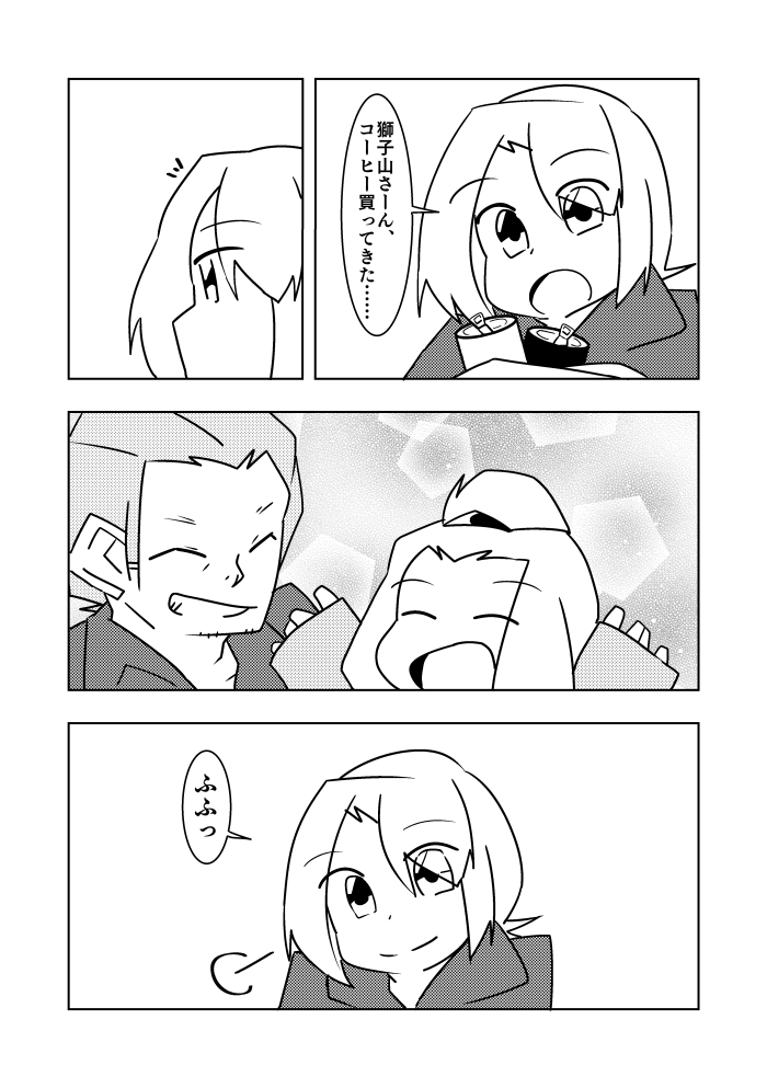 【獅子山】 「ちげーよ心配だから忙しい中来てやったんだろうが」 特別保安部所属のエンジニア。 前の部署では不正を行っていた上司に楯突き嫌われ飛ばされた。 特別保安部では珍しい人間の職員。 煙草に染髪、無精髭と駄目人間に見えるが常識人。 面倒見も良くくろすけを気に掛けている。 30代前半の頃にフジモトとチームを組んでおり、仲が良い。 一人称:俺/二人称:お前 性別:男 年齢:39歳 誕生日:3月8日 身長:180cm/体重:70kg 血液型:A型 好物:煙草 趣味:ゲーム 種族:人間 |