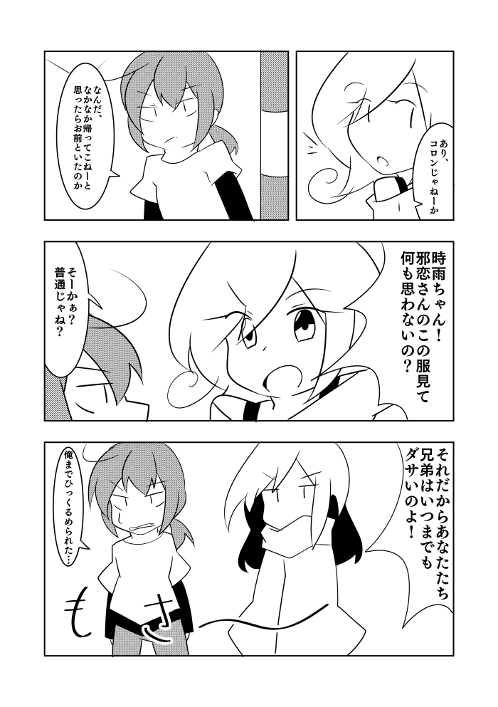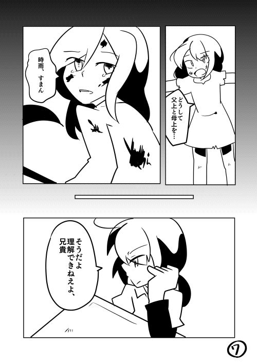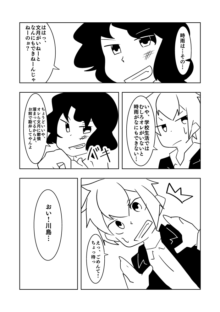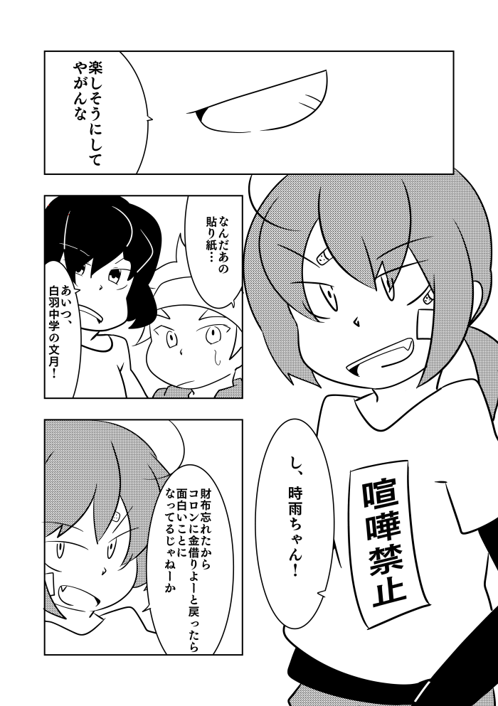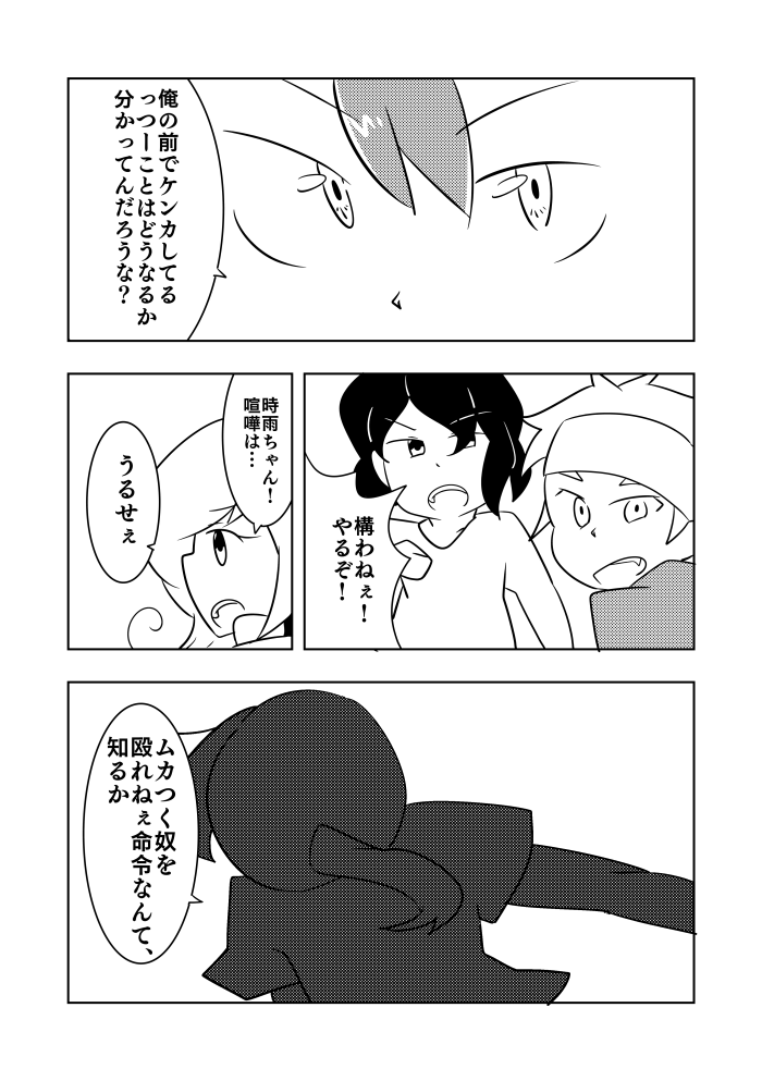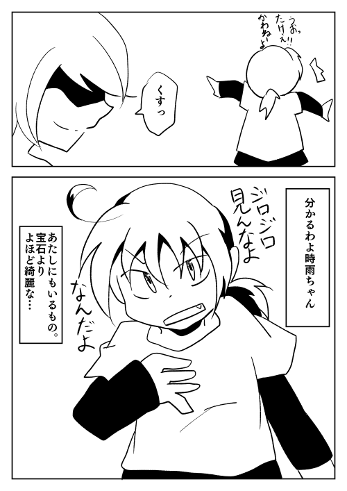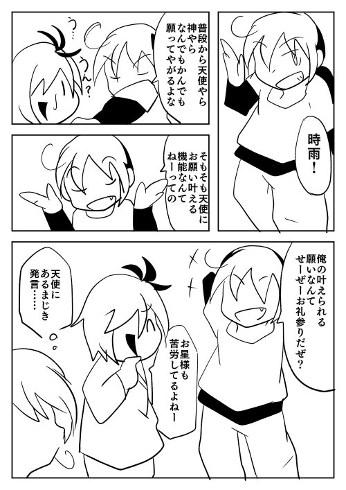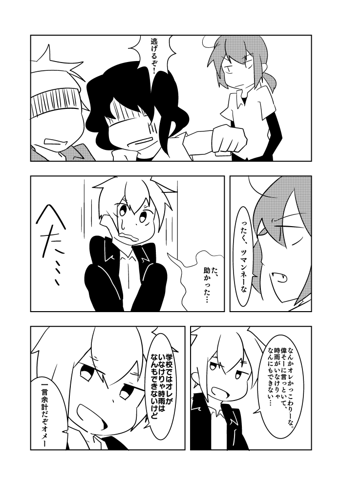 【時雨(文月時雨/ふみつき しぐれ)】 「ぶっ殺されてーヤツからかかってきやがれ!」 下界に降りてきたピピの人探しに協力してくれた不良少年。 中学生にして負け無しのケンカの強さらしい。 短気で粗野だが面倒見は良く、実は苦労人。 インスタント食品が主食。 一人称:俺/二人称:おめー・テメェ 学年:中学1年 誕生日:10月28日 身長:155cm/体重:53kg 血液型:O型 好物:カップ麺 得意な教科:無し |