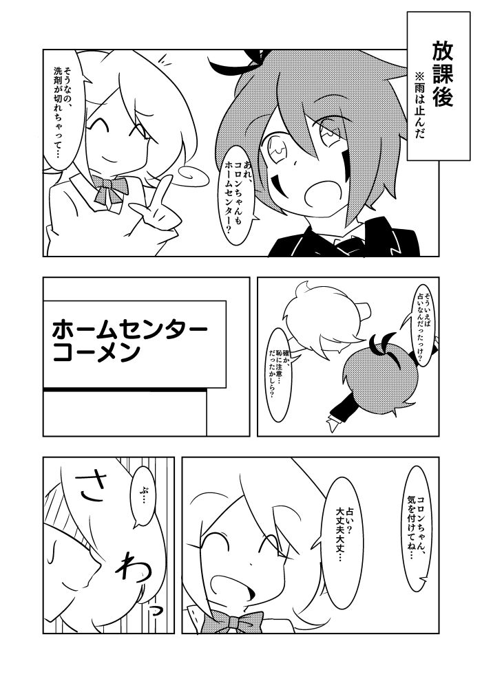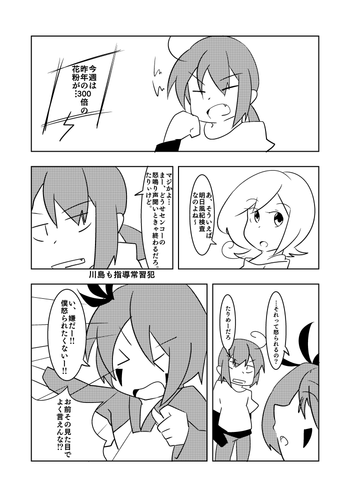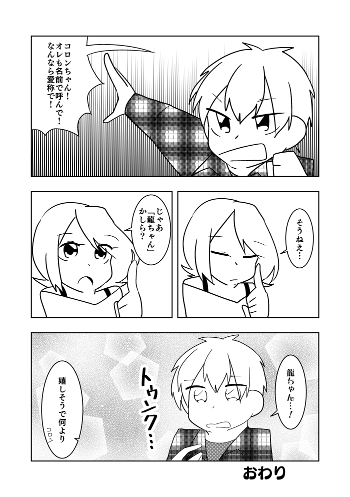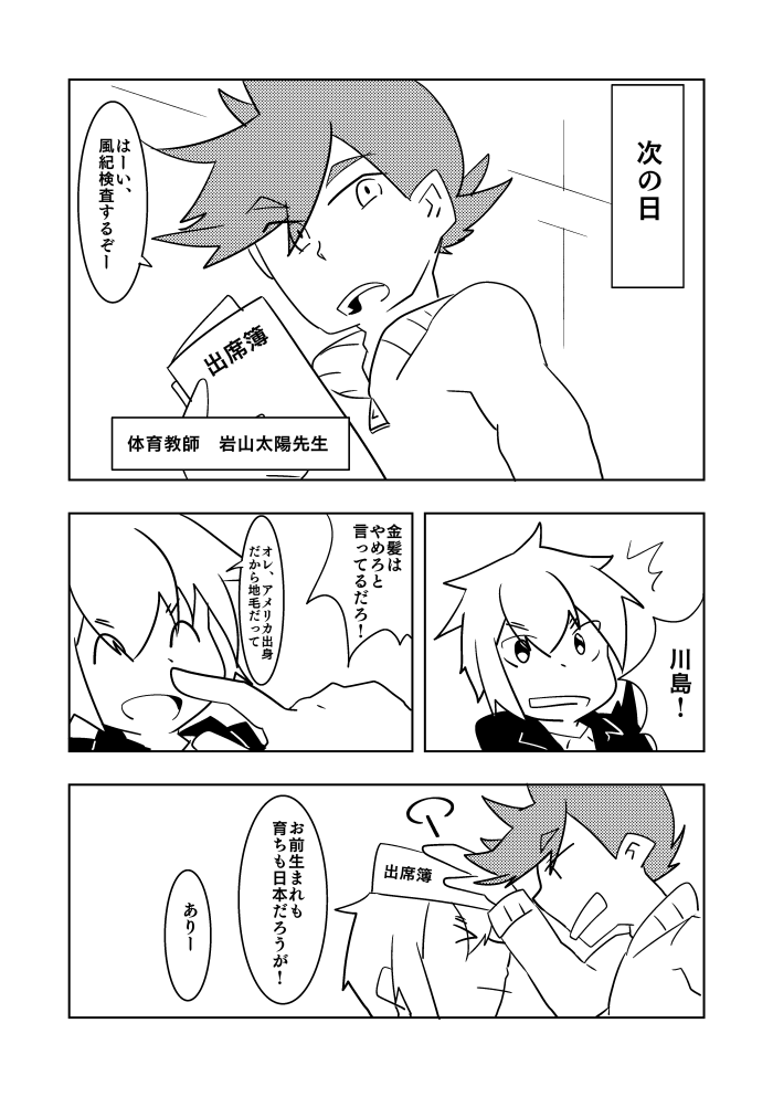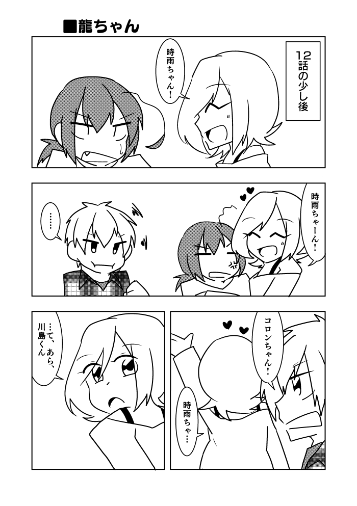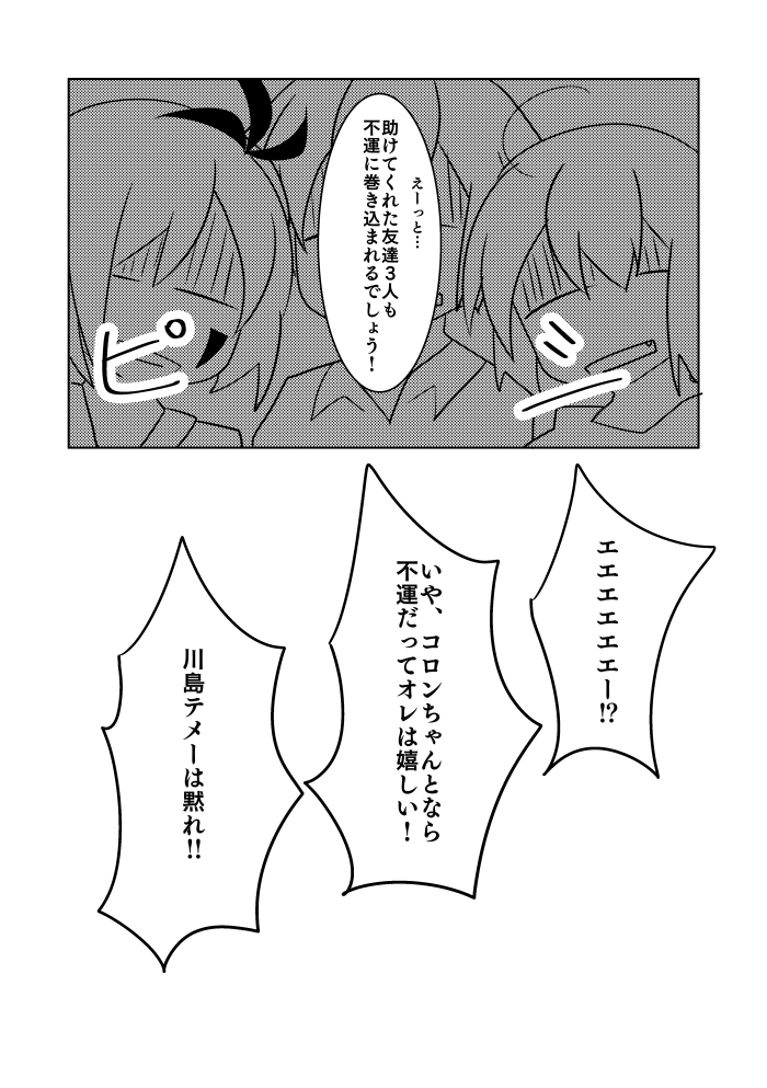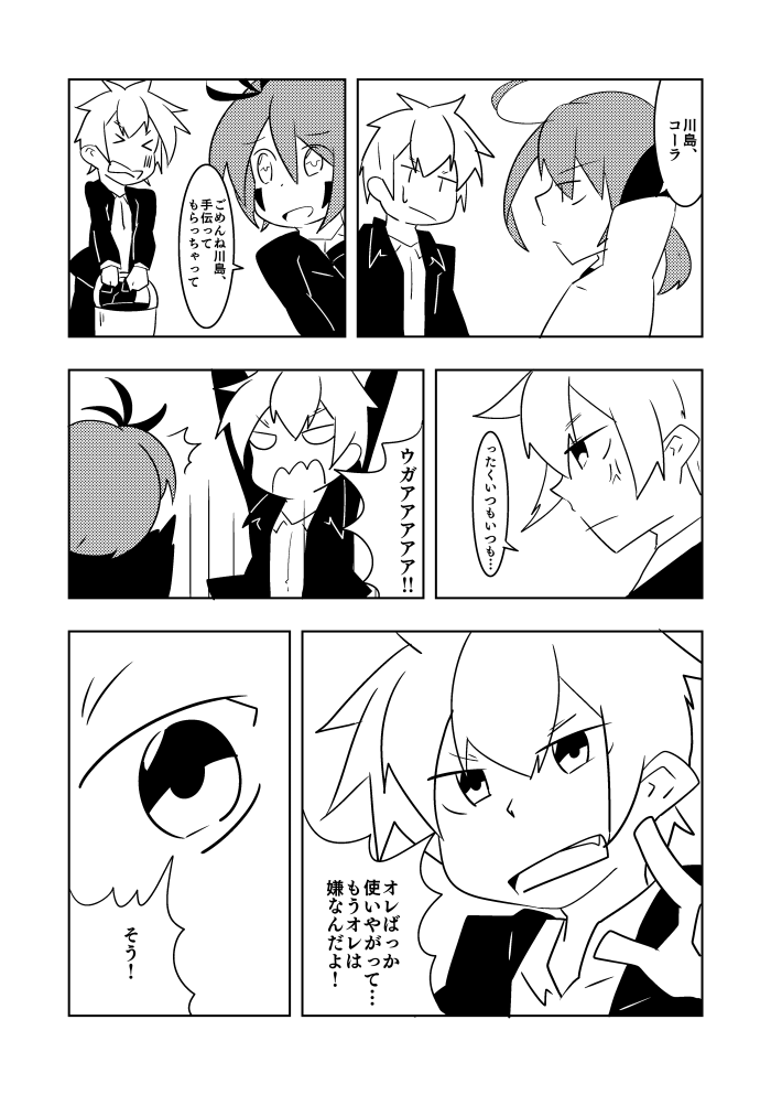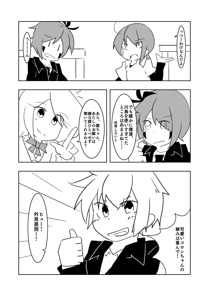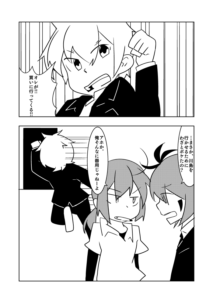 【川島(川島龍一/かわしま りゅういち)】 「コロンちゃん!オレの勇姿、見ててくれよな!」 自称時雨の側近、通称「パシリ特攻隊」な不良少年。 ケンカは弱くはないが、時雨が強すぎるのでいまいち目立たない。 軟派でお調子者、女の子に目が無い。 意外と器用で日曜大工などが得意。 一人称:オレ/二人称:お前・君(女子限定) 学年:中学1年 誕生日:7月3日 身長:159cm/体重:52kg 血液型:B型 好物(?):可愛い女の子 得意な教科:技術 |